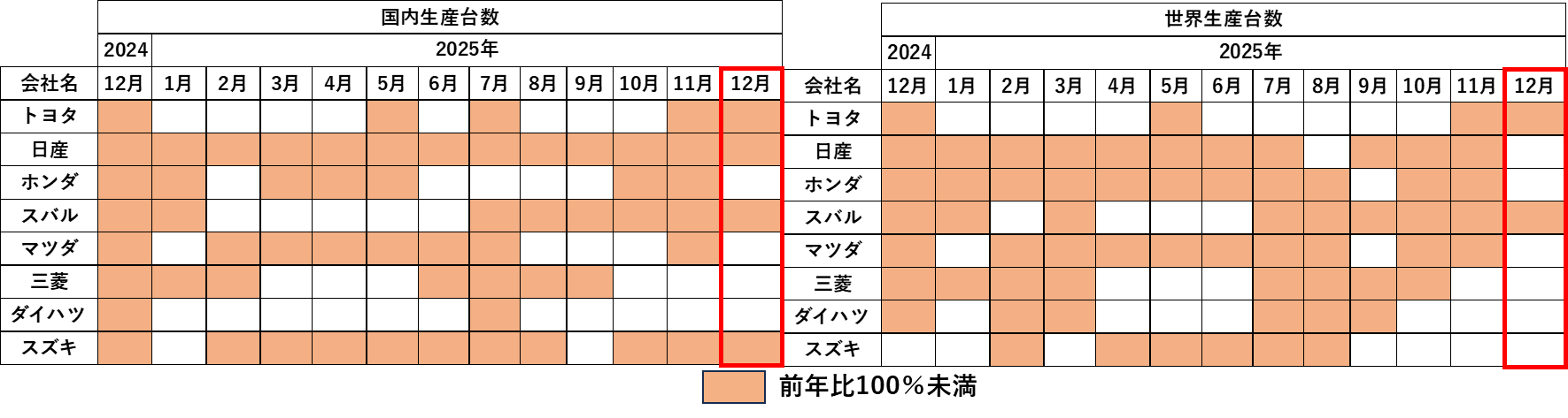 とは言え、前々年同月比では100%を超えた会社が国内生産では三菱とダイハツ、世界生産では三菱とスズキのそれぞれ2社ずつでした。前年同月比の星取表を下に示します。