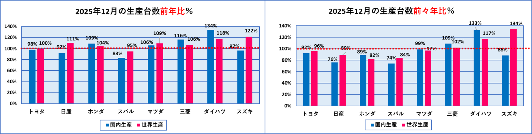 昨日、日系自動車メーカーから2025年12月及び2025年1月~12月のの生産台数の発表がありました。2025年は自動車製造業にとってはなかなか厳しい年でしたが、年末にむけて少し上向いてきた感があり、12月は前年同月を上回った会社が国内生産に関しては4社、世界生産では6社となりました。前年同月を上回った会社が過半数を占めるのは2025年では初めてでした。