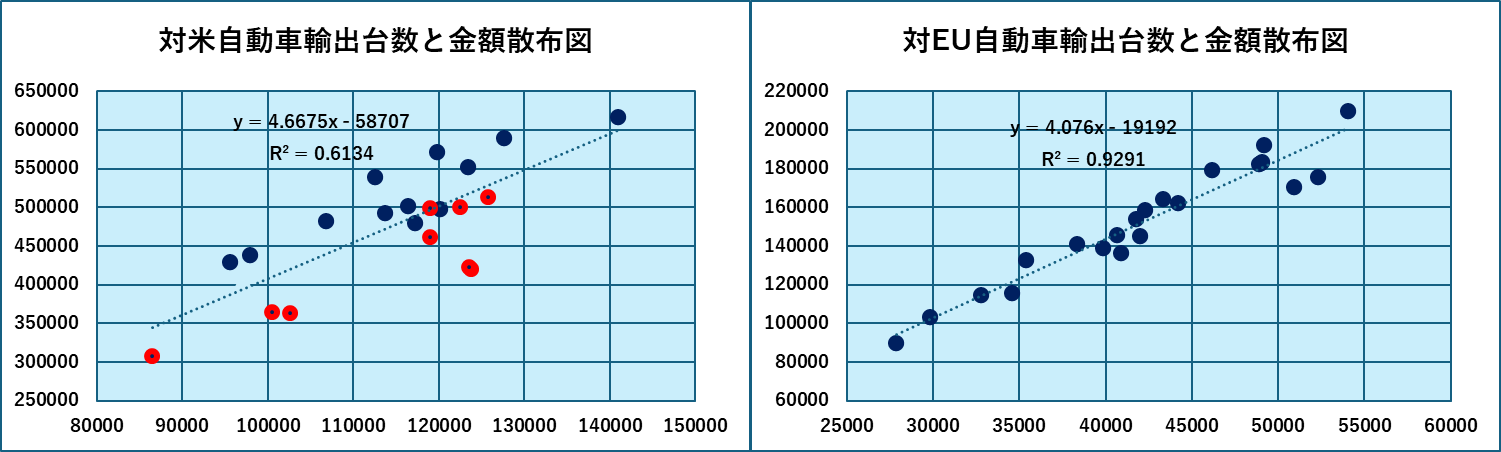 次に対米と対EUで、輸出台数と金額の散布図を描いてみました。(下図)対EUでは台数と金額は極めて高い相関を示します。(R2乗値=9.291)対して対米の場合にはかなり広範囲にばらついており、しかも2025年4月以降の点はすべて回帰線の下にあります。明らかにこの期間の単価は他の期間よりも低いことを示しているわけです。