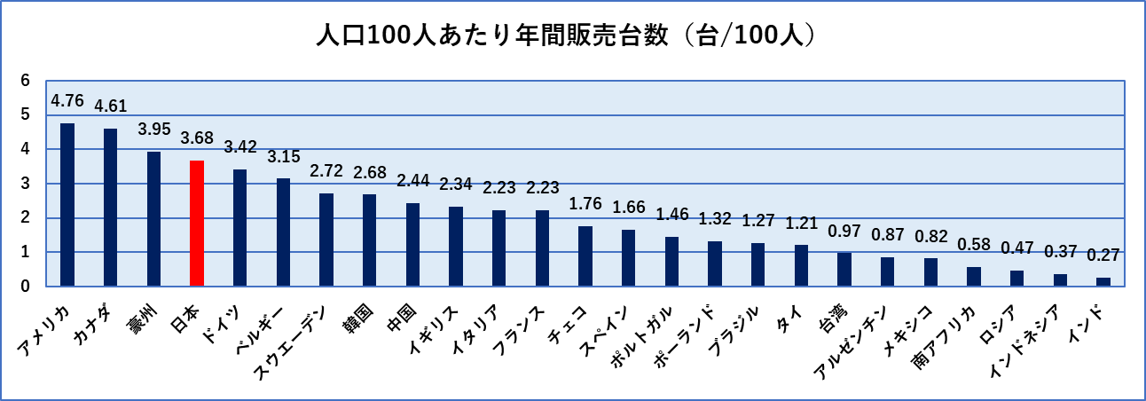 人口100人あたりの販売台数は上図のようになりました。北米のアメリカ、カナダがワン、ツーで続いてオーストラリアが3番目で日本は4番目でした。こうして眺めると一見一人あたりGDPと関係していそうに見えますが、必ずしもそうではありません。下図をご覧ください。