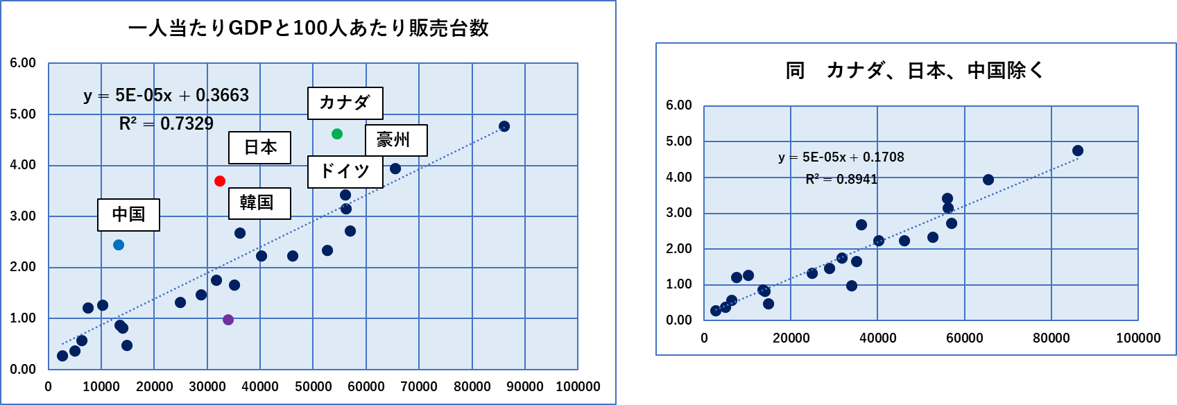 左図は一人あたりGDPと100人あたり販売台数の散布図ですが、おおよそ回帰線状に並ぶ中で大きく外れた国が3つあります。それはカナダ、日本、中国です。この3か国を除くと右図になりR2乗値は0.9近くまで上がります。さらに左図に戻って回帰線の上に位置する国をみると一定以上のGDPのある国ではオーストラリア、ドイツ、韓国です。