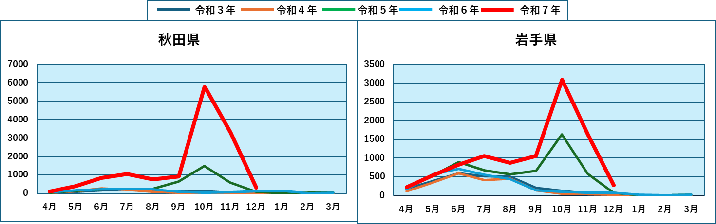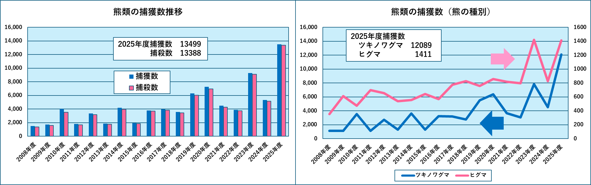また都道府県別の捕獲数については、先月にご紹介したように、北日本と西日本では大きく傾向が異なっており、北日本ではとびぬけて最多であるのに対し、西日本(京都、島根、兵庫、広島、鳥取)では昨年から激減しており、こうした違いはエサとなるドングリ等の豊凶が要因ではないかと考えています。