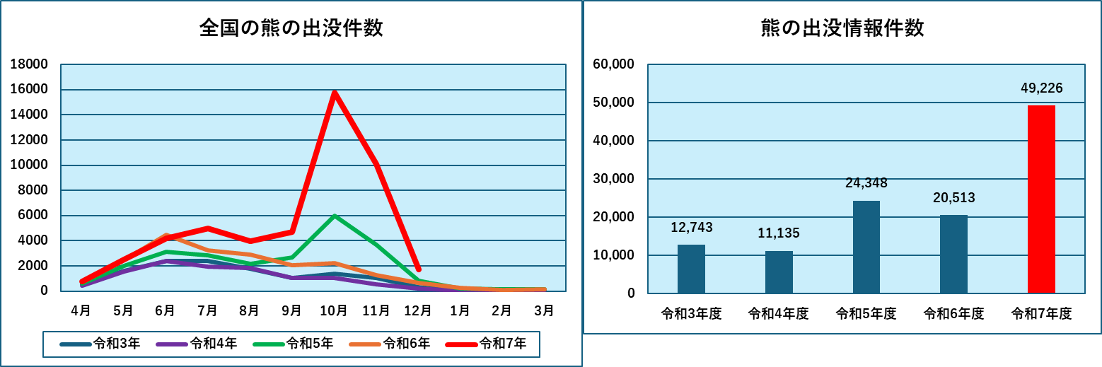 出没情報の件数は4~12月でおおよそ5万件にも達しました。日本に棲息しているクマはツキノワグマが42,000頭、ツキノワグマが12,000頭と言われていますので、出没情報数がほぼ棲息数に近いということになります。同じクマが複数回目撃されているケースが多いとしても、出没情報の多さにこの問題の深刻さが現れています。