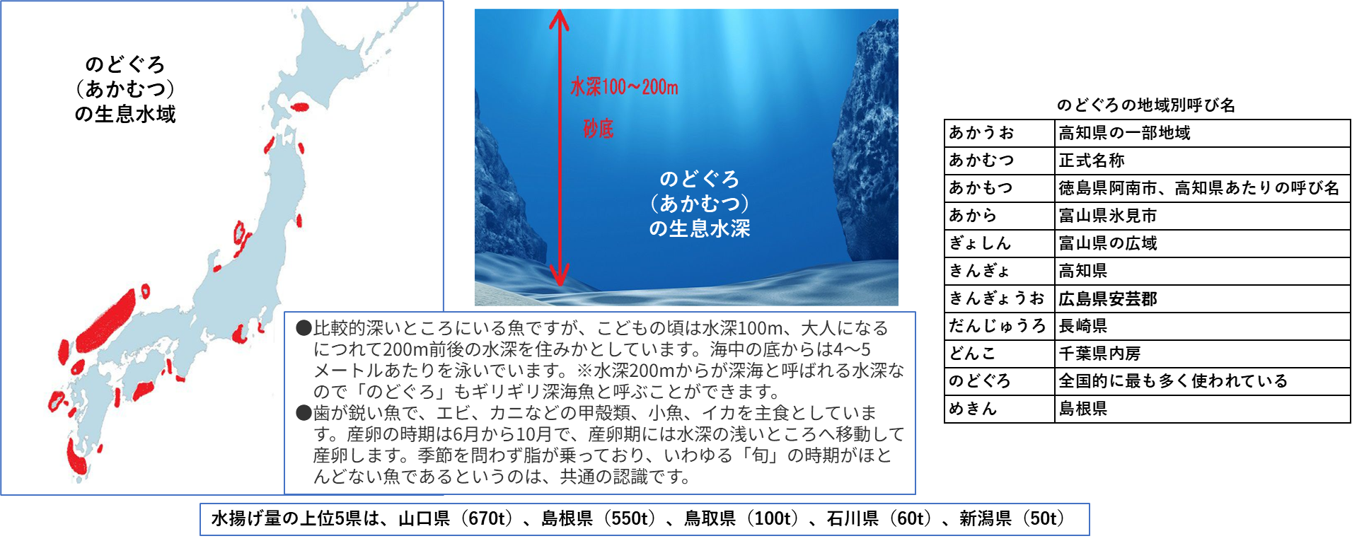 「のどぐろ」は日本の多くの海域で生息しており、水深100~200メートル、海底から4~5メートルのところにいる深海魚に位置付けられます。漁獲高では島根と山口が1位、2位です。また呼び名も全国でいろいろな名前で呼ばれているようです。「のどぐろ」がもっと手ごろな値段で食べられる日は近いようです。
