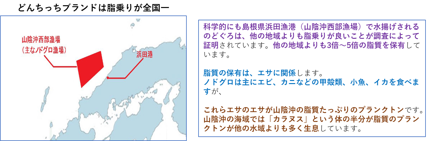 この浜田沖の「のどぐろ」が脂がのっていることについては、のどぐろが食べているエビ、カニなどの甲殻類、小魚、イカのエサとなる「カラヌス」というプランクトンに含まれる脂肪が多いためであると書かれていました。エサのエサが脂肪をたくさん蓄えているからということです。