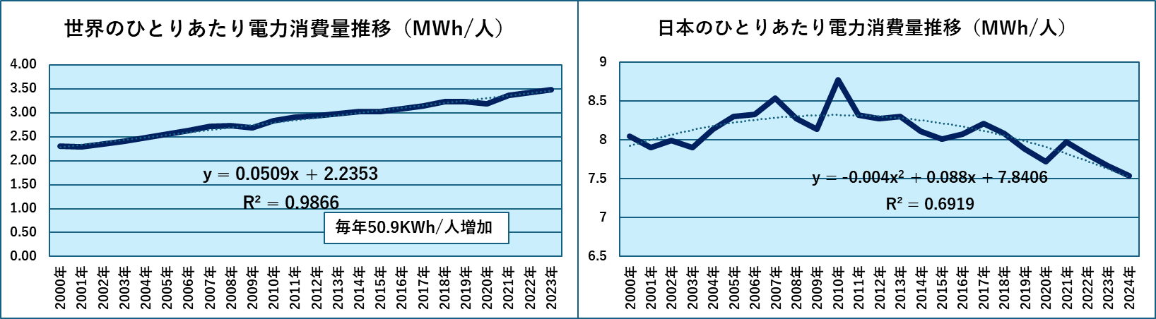 世界と日本のひとりあたりの電力消費量の推移です。