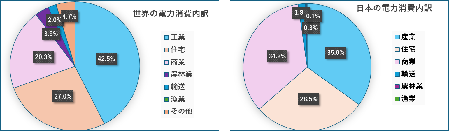 最後は2023年における需要分野別最終電力消費内訳です。世界、日本とも産業(工業)、住宅(家庭)、商業(および公共サービス)の3者で90%以上を占めます。日本は特に商業および公共サービスの割合が高いようです。