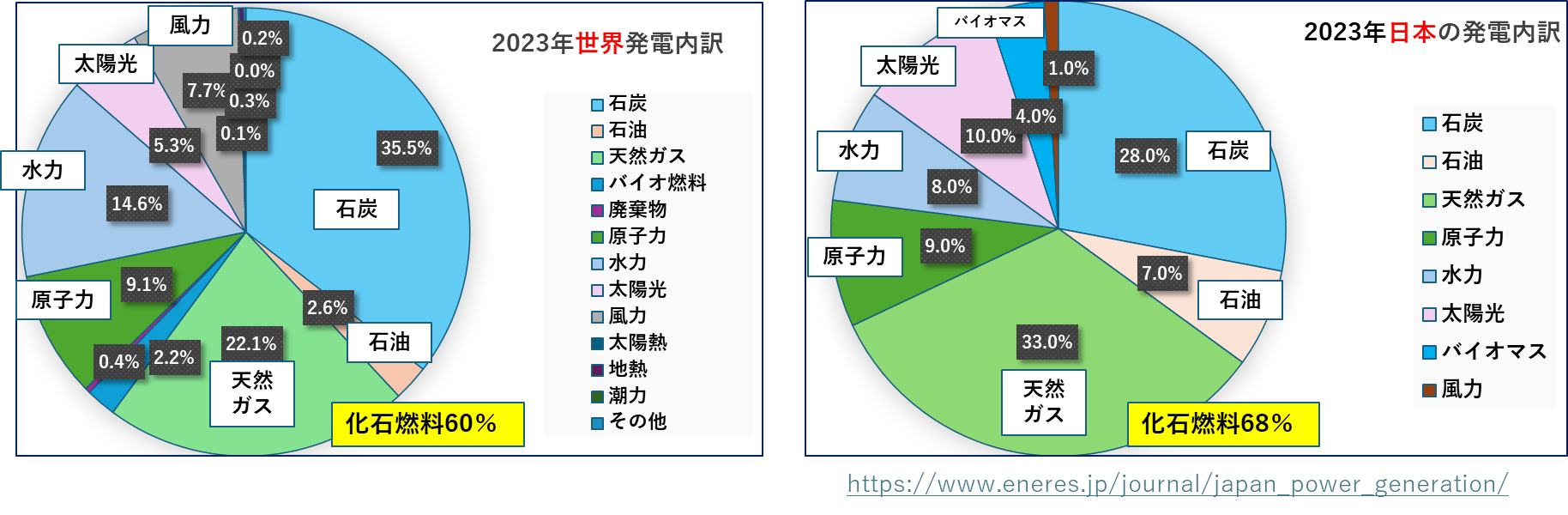 2023年における世界と日本の電源ソース別発電量です。化石燃料の割合では世界が60%、日本が68%とまだ日本は世界の平均にさえ届いていません。日本のデータは電源開発のサイトからの引用です。