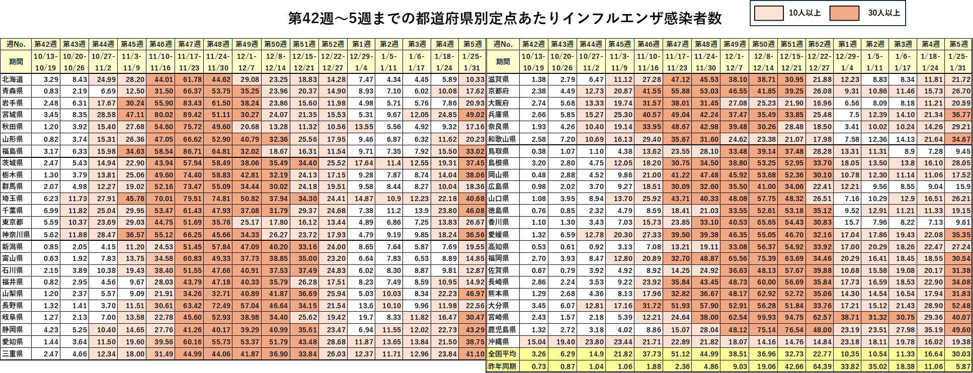 選挙とオリンピックに隠れてあまり報道されていないようですが、インフルエンザはしっかりと感染拡大を続けています。今季の第2波は確定となりました。すでに定点あたり感染者数が30名を超えた都道府県の数が22と約半数に達し、全国平均も30人を超えました。少なくともあと2週間ほどは感染者が増加する可能性が髙いと思われます。下表をご覧ください。