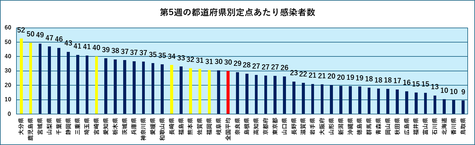 直近第5週の各都道府県の定点あたり感染者数では、九州がワン、ツーでしたが、その後宮城、山梨、千葉、静岡、三重、埼玉と続き、東北、関東、東海と地域がばらついています。九州(下図の黄色)は沖縄を除き、すべて全国平均を上回りました。