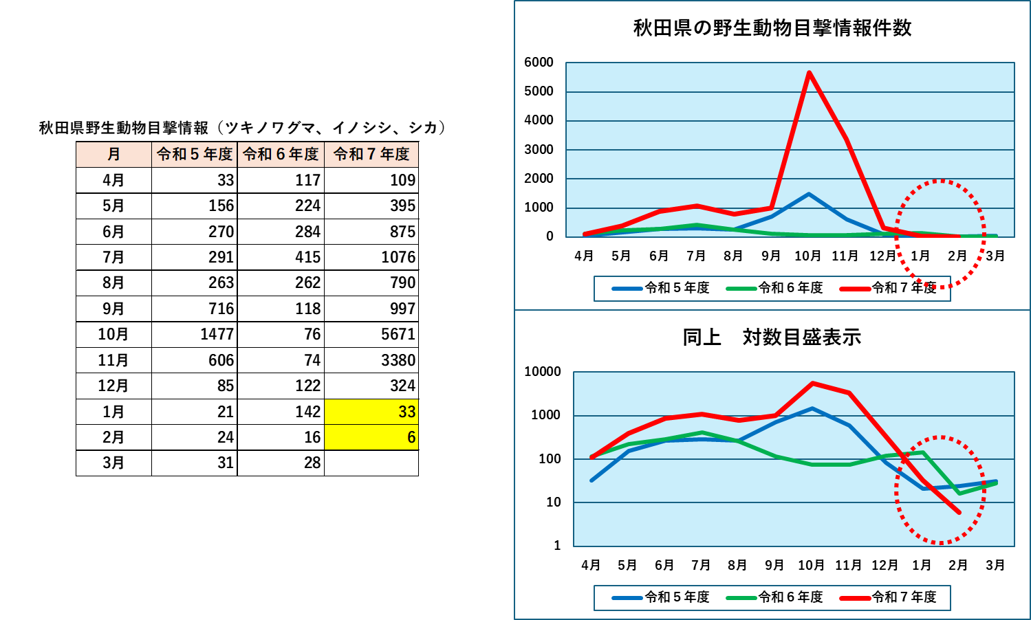 目撃情報は、クマ、イノシシ、シカの合計でそのほとんどクマです。秋田県の目撃情報は1月に入り激減しています。右上のグラフでは昨年、一昨年との比較が難しいので、その下に対数目盛表示も描いてみました。過去2年と比較しても1月および2月も平年並みになったと言ってもよいのではと思います。
