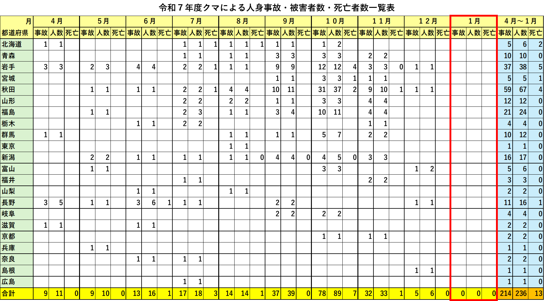 令和7年度の都道府県別被害者と死亡者数についてまとめてみました。236名の被害者のうち半数以上が秋田、岩手、福島の3県で占められました。死亡者に至っては秋田、岩手の両県で約7割になります。