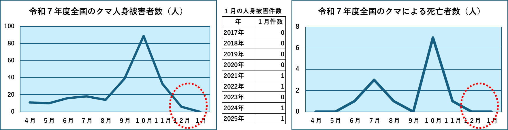 12月は人身被害者が6名でていましたが、1月は被害者なしとなりました。上図の中央に過去9年間の1月のクマによる人身被害者数を表示していますが、いずれもゼロまたは1人でした。心配された1月の被害はなんとか防げたようです。