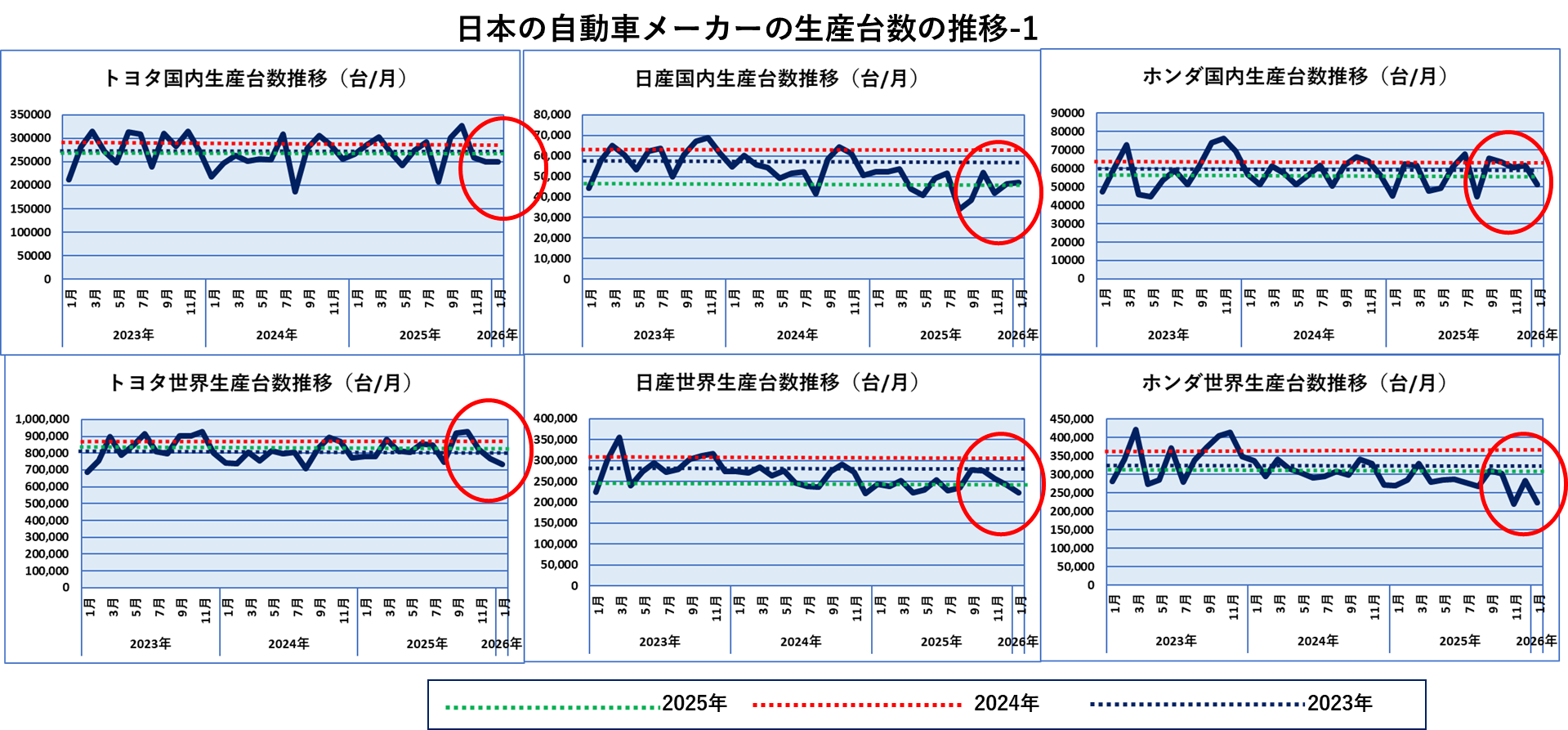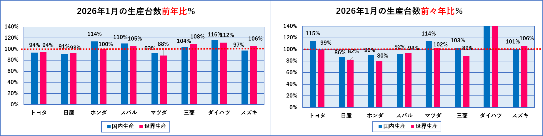 先週木曜日に日系自動車メーカーから2026年1月の生産台数が発表されましたが、全般に低調な滑り出しとなった模様です。各社の国内生産、世界生産の前年同月比、前々年同月比のグラフからご覧ください。