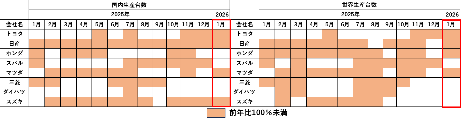 2025年通年で国内生産においては、前年越え:前年未満=43:53、世界生産では前年越え:前年未満=34:62でした。2026年はどうなるのでしょうか?