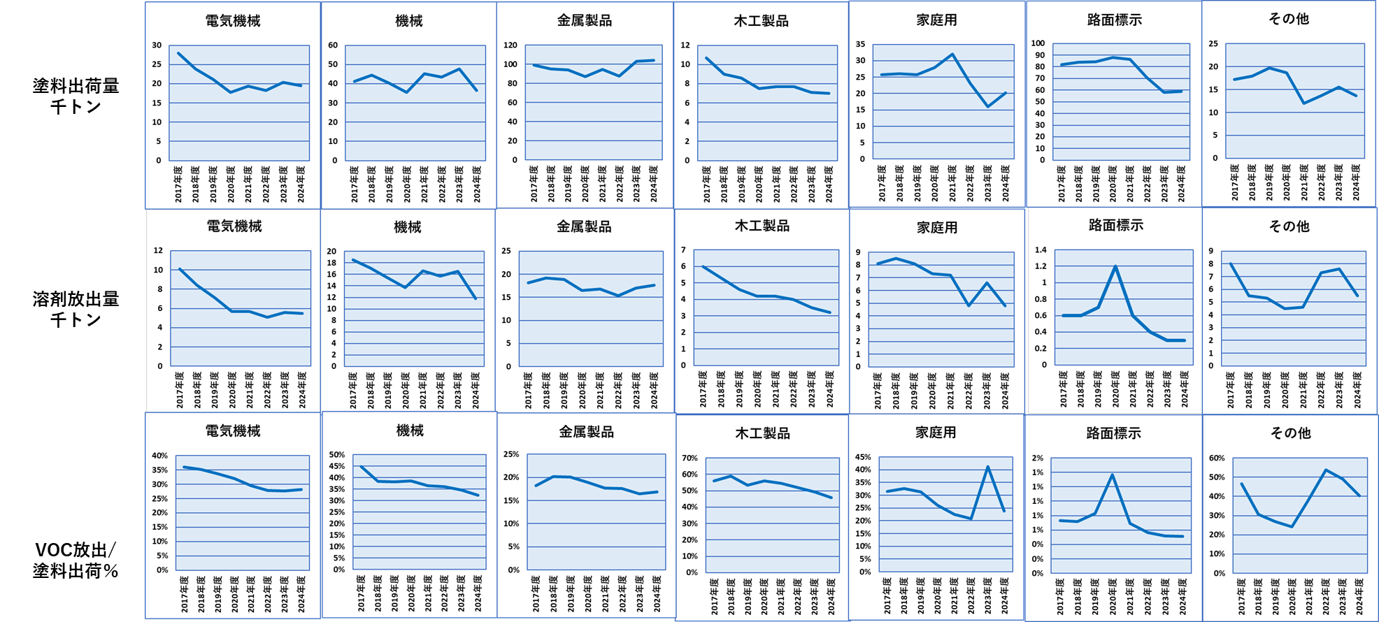 最初は需要分野別の①塗料出荷量、②VOC排出量、③VOC排出量/塗料出荷量%についての2017年年度から2024年度までの推移のグラフからご覧ください。①には希釈シンナーが含まれていません。 ②は希釈シンナーからのVOC排出量が含まれています。③は塗料出荷量に対するVOCの排出量%で、これが低いほど塗装時に排出されるVOCの割合が低いことになります。すなわち①はもちろん、②も出荷数量の増減の影響を受けますが、③は出荷数量の影響をうけないため、本当の意味でのVOCの増減がわかる数値となっています。