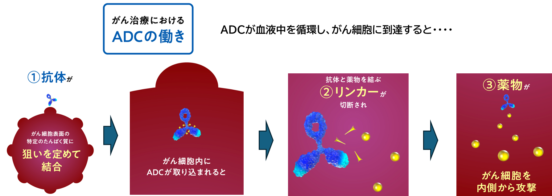 抗体はこの場合がん細胞に対してだけ特別な結合部位をもっていますので、ADCをがん細胞だけに結合させてくれる薬剤の運び屋さんです。そしてがん細胞にとりついたADCががん細胞内に取り込まれると、それまでADCの中で抗体と薬剤を結合していたリンカーが切断され薬剤が放出されます。そして放出された薬剤ががん細胞を内側から攻撃するという仕組みになっています。