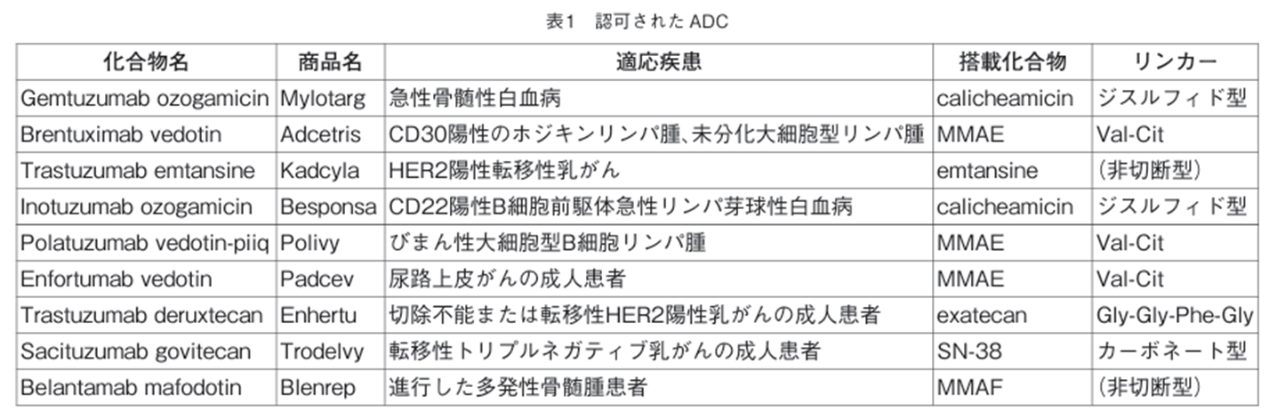 すでに認可されたADCの一覧表がありました。これにはリンカーのタイプ(どこが切断されるのか?)がわかりました。表の右端の欄です。