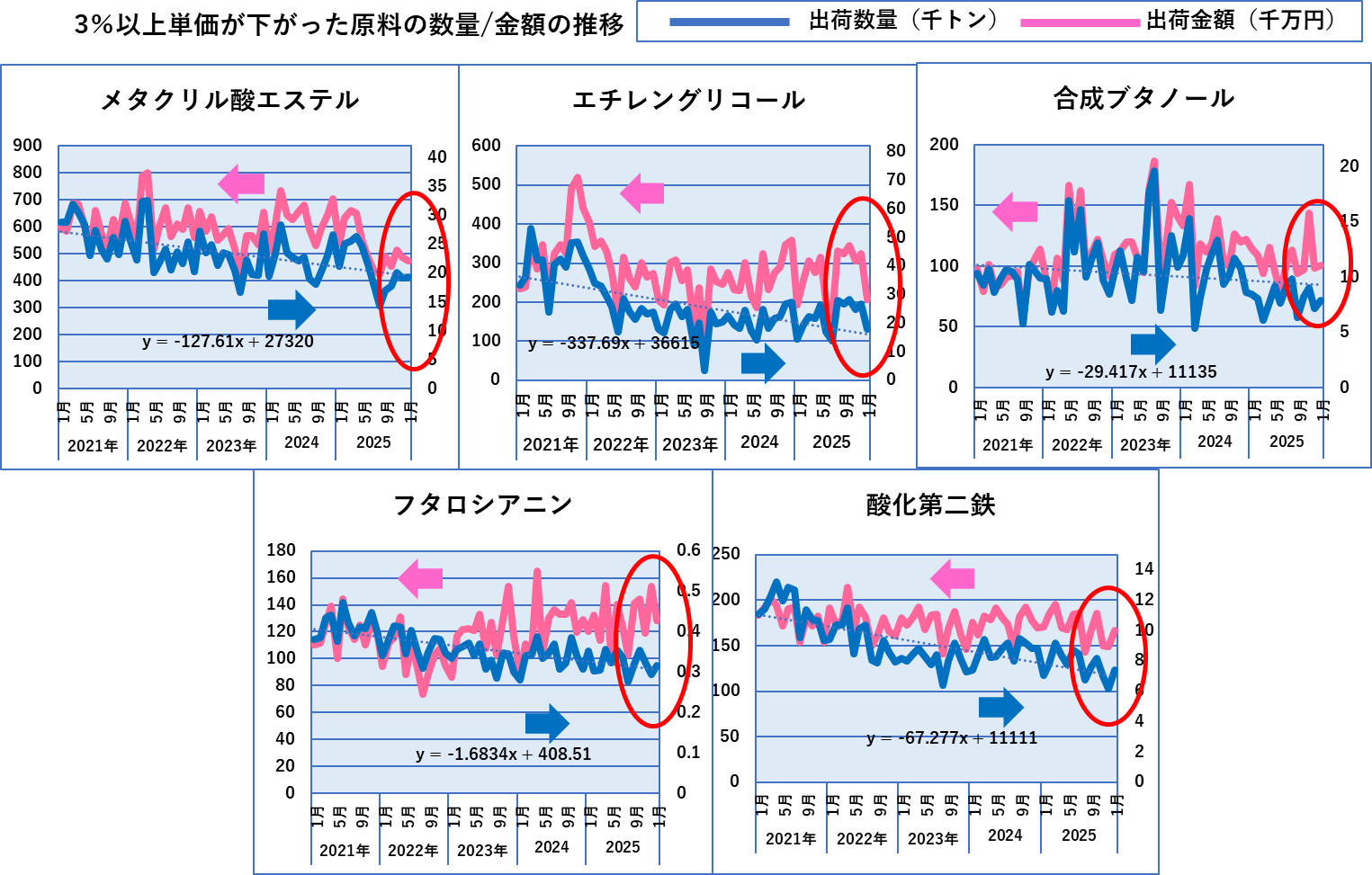 3%以上価格がダウンした原料も基本的には数量減少、金額増大傾向の中での価格ダウンになります。金額の減少幅が数量の減少幅を上回るか、数量の増加幅が金額の増加幅を上回れば価格ダウンとなります。