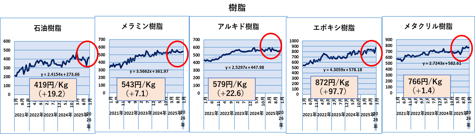 樹脂はすべて価格アップでした。石油樹脂、アルキド樹脂、エポキシ樹脂が3%を超える大幅アップとなりました。