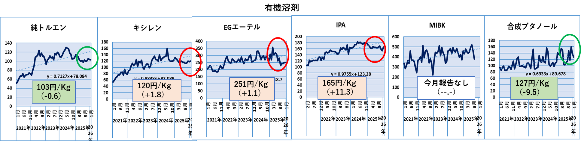 有機溶剤では、1月の時点では大きな動きはありません。イソプロピルアルコールの価格アップ、合成ブタノールの価格ダウンが目立つ程度です。
