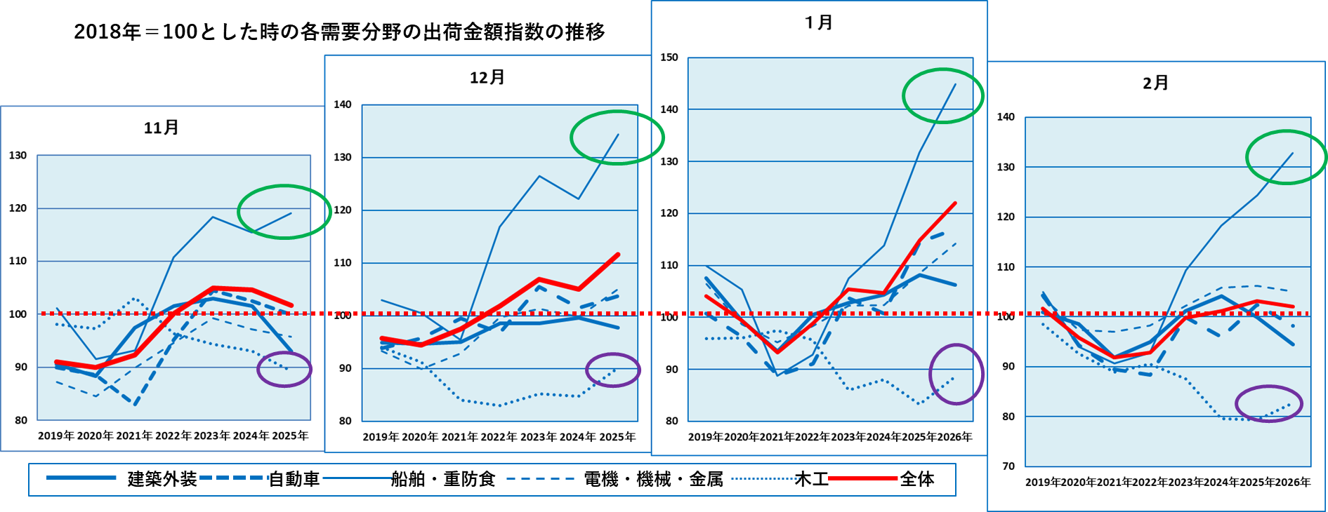 最後に2018年の各月を100とした場合の各需要分野別の指数値を示します。月によってばらつきがありますが、船舶・構造物が2018年比で130~150と高い数値である一方、木工が80~90と低迷しています。