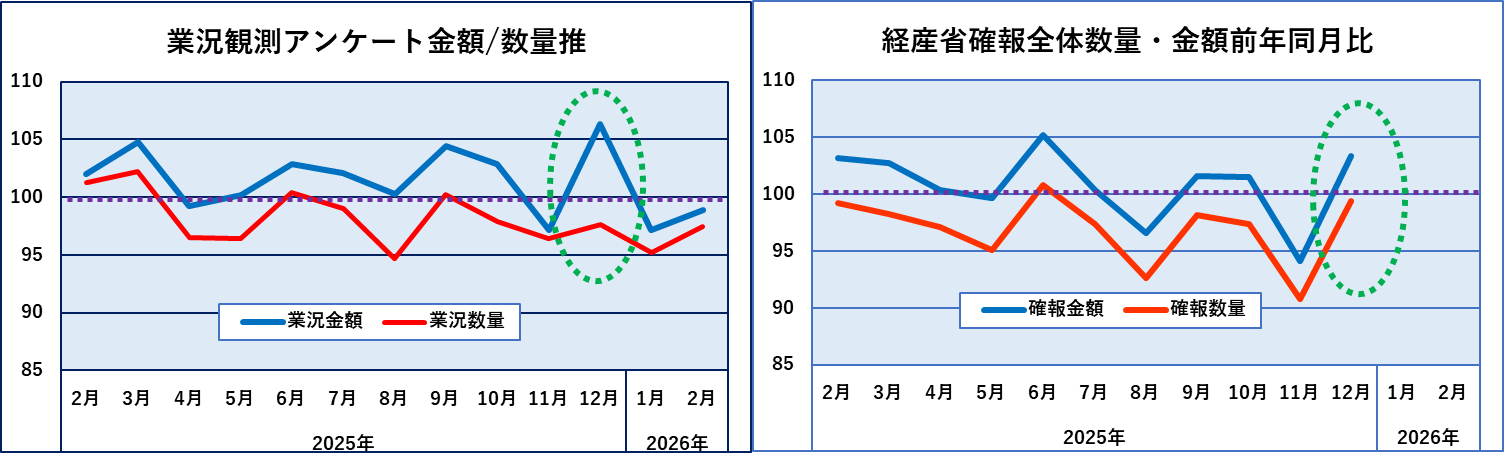 業況観測アンケートと経産省確報の比較です。業況においては2025年12月度において数量と金額の前年比が大きく乖離しましたが、2026年1月2月では金額、数量が近づいてきています。経産省確報でもそうなっているのかどうか確認したいところです。