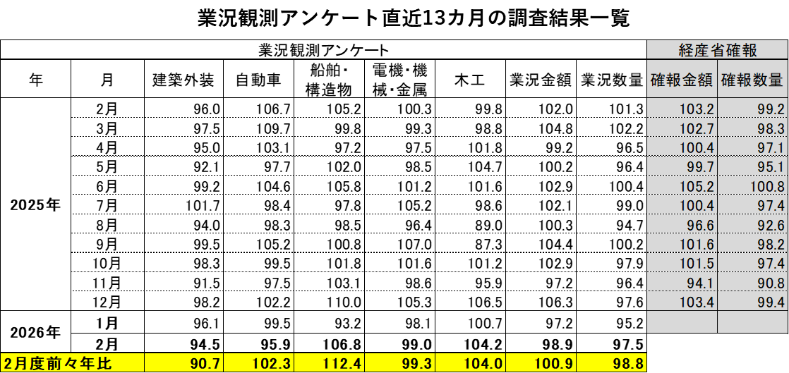 先週金曜日に業況観アンケートを日塗工から受領いたしました。ただし経産省確報を先週段階で受領せずにおりましたので、業況観測アンケートの補足データとしては例月に比べてだいぶ間引いて報告せざるを得なくなりましたことをお詫びします。