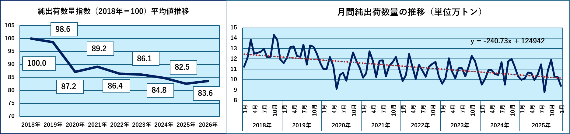 下は純出荷数量の年平均指数と月間純出荷数量の推移です。特に目立った変化はありませんが、この先のイラン情勢の影響が不安視されます。