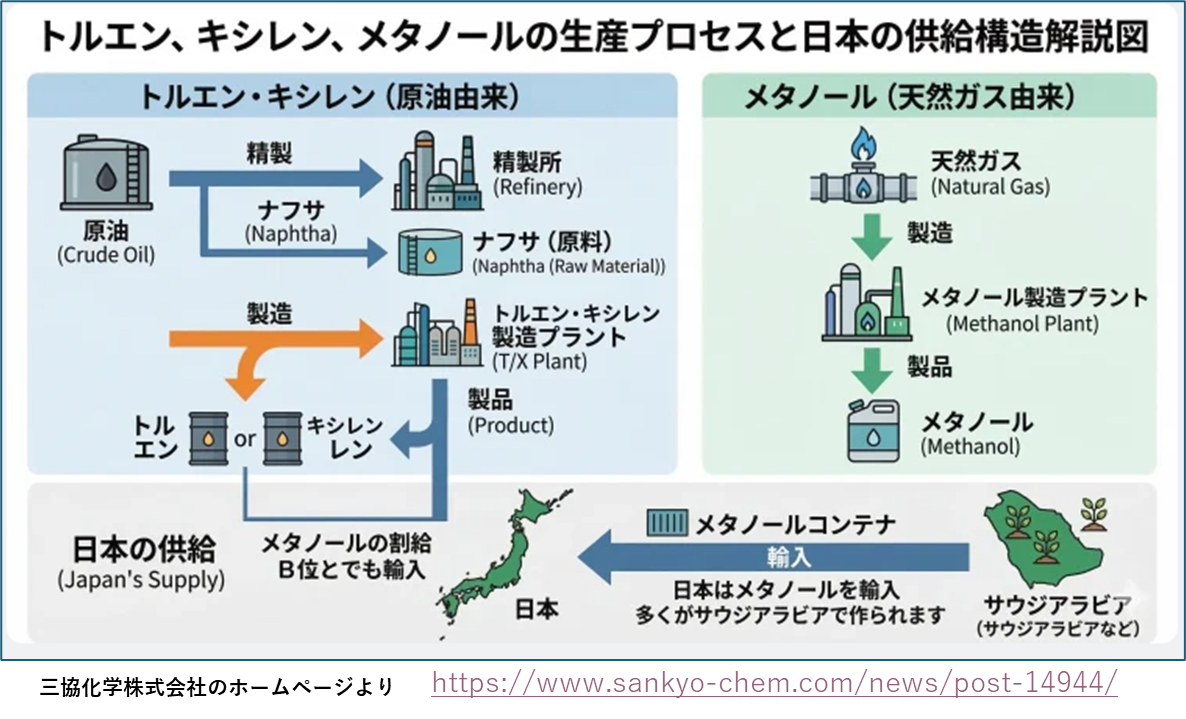 ただし、メタノールだけは例外であり、主として天然ガスから(脱硫⇒水蒸気改質⇒合成ガス圧縮⇒メタノール合成⇒蒸留)の工程で作られているそうです。