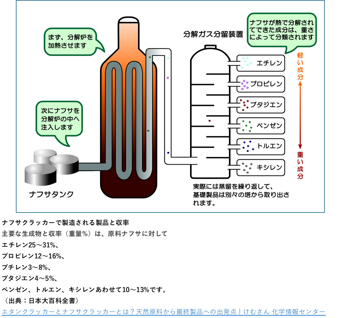 原油の分留で得られたナフサは分解工程にかけられ、エチレン、プロピレン、ブタジエン、トルエン、キシレンの留分に分別されます。そしてその収量はおおよそ以下のようになっています。