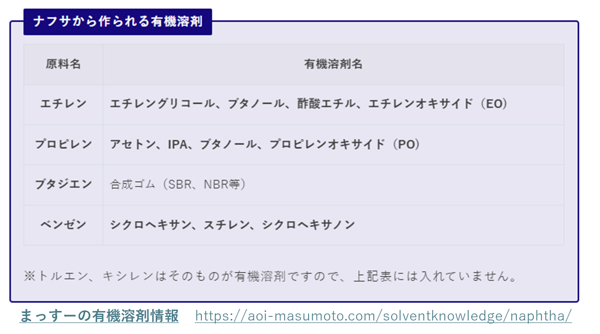 これらの留分からさまざま石化製品が作られますが、有機溶剤とその原料との関係は以下のようになっています。