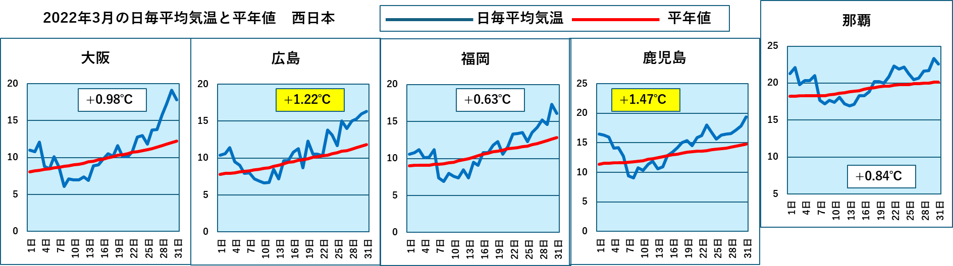 3月の全国主要10都市の気温は、やはり平年値よりも高めでした。各都市の日毎平均気温と平年値の推移を下図に示します。平年値は1991年から2020年までの30年間の平均です。