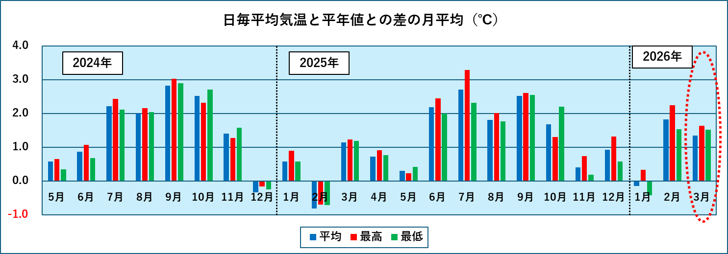 日毎平均気温、最高気温、最低気温いずれの平年値との差も北髙南低でした。