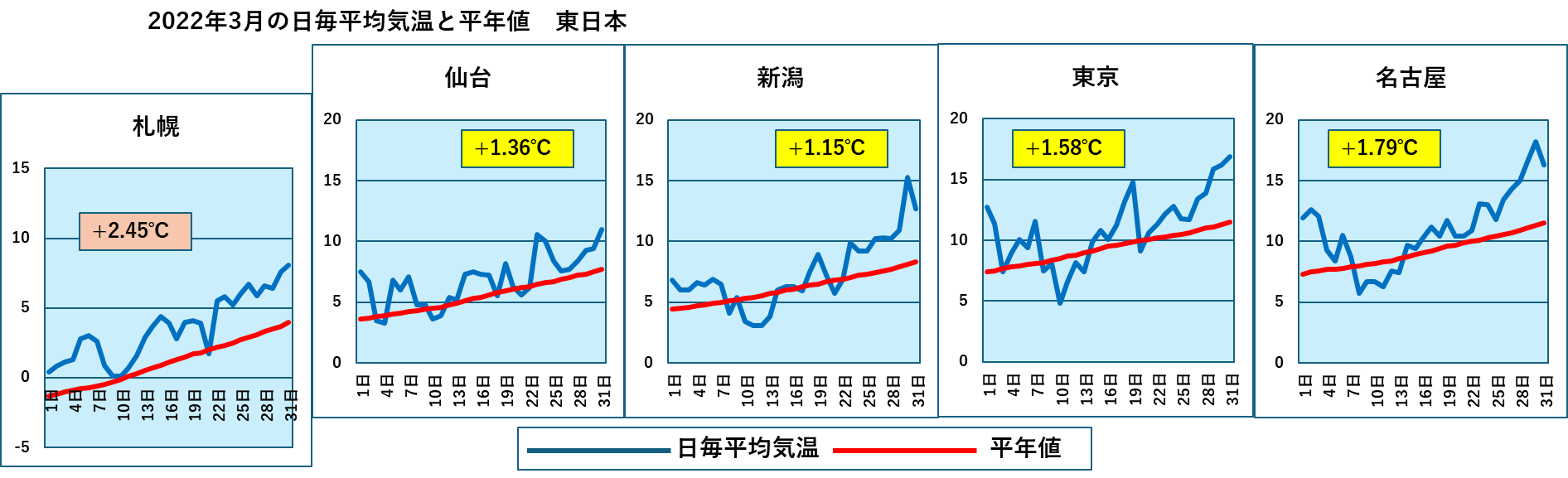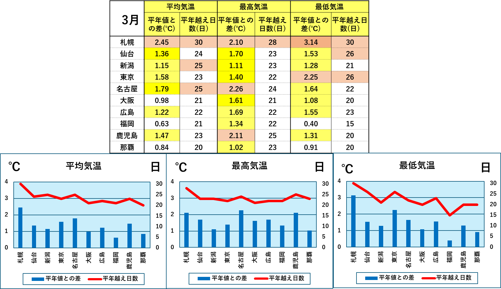 特に高かったのは札幌で、平年値を下回った日が3日しかなく、月平均では2.45℃も高くなりました。月の初めと月末が高く、10日前後だけが低い状況でした。