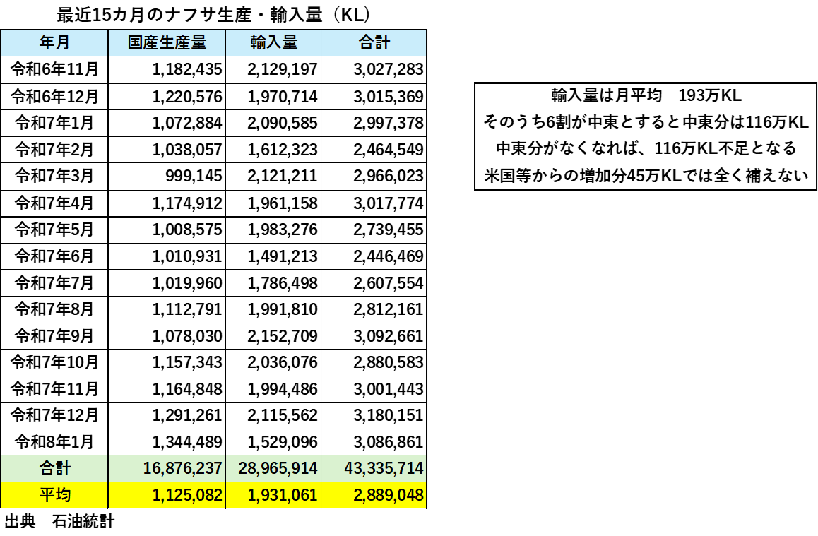 アメリカなど中東以外からのナフサ調達については、「4月に通常の2倍の90万KL(増加分は45万KL)を調達した」と報道されてはいるものの、このナフサ輸入量では量的には中東からの輸入分を賄うには全く足りません。下表をご参照ください。中東から輸入しているナフサは、一カ月に100万KL以上あると推定されますので、45万KLの増加だけでは不足してしまいます。
