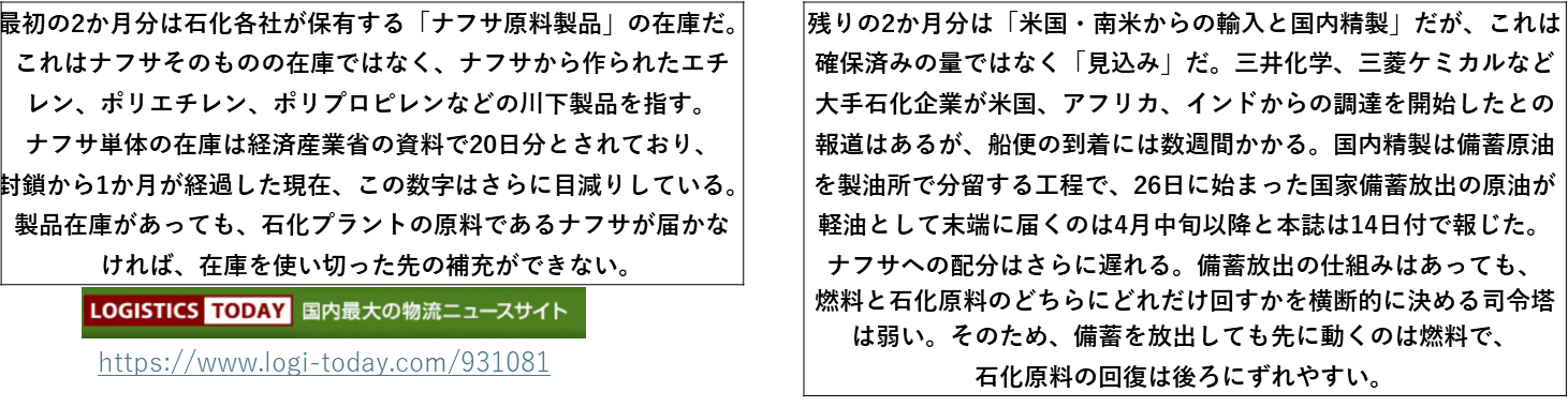 また②の中での「化学品全体の国内需要4か月分を確保」という内容が、木原官房長官の3月30日の発言「石油化学各社が保有するナフサ原料製品の在庫が国内需要の2か月分、米国・南米からの輸入と国内精製でさらに2か月分を確保できる見通し」という内容を指しているのであれば、最初の在庫の2カ月分、残りの米国、南米、国内精製での2カ月分については以下のような指摘があります。この指摘が正しいとすれば、ナフサそのものの在庫はないに等しいことになりますし、さらに中東以外からの代替輸入も予定ではなくまだ確定されたものではないことになります。