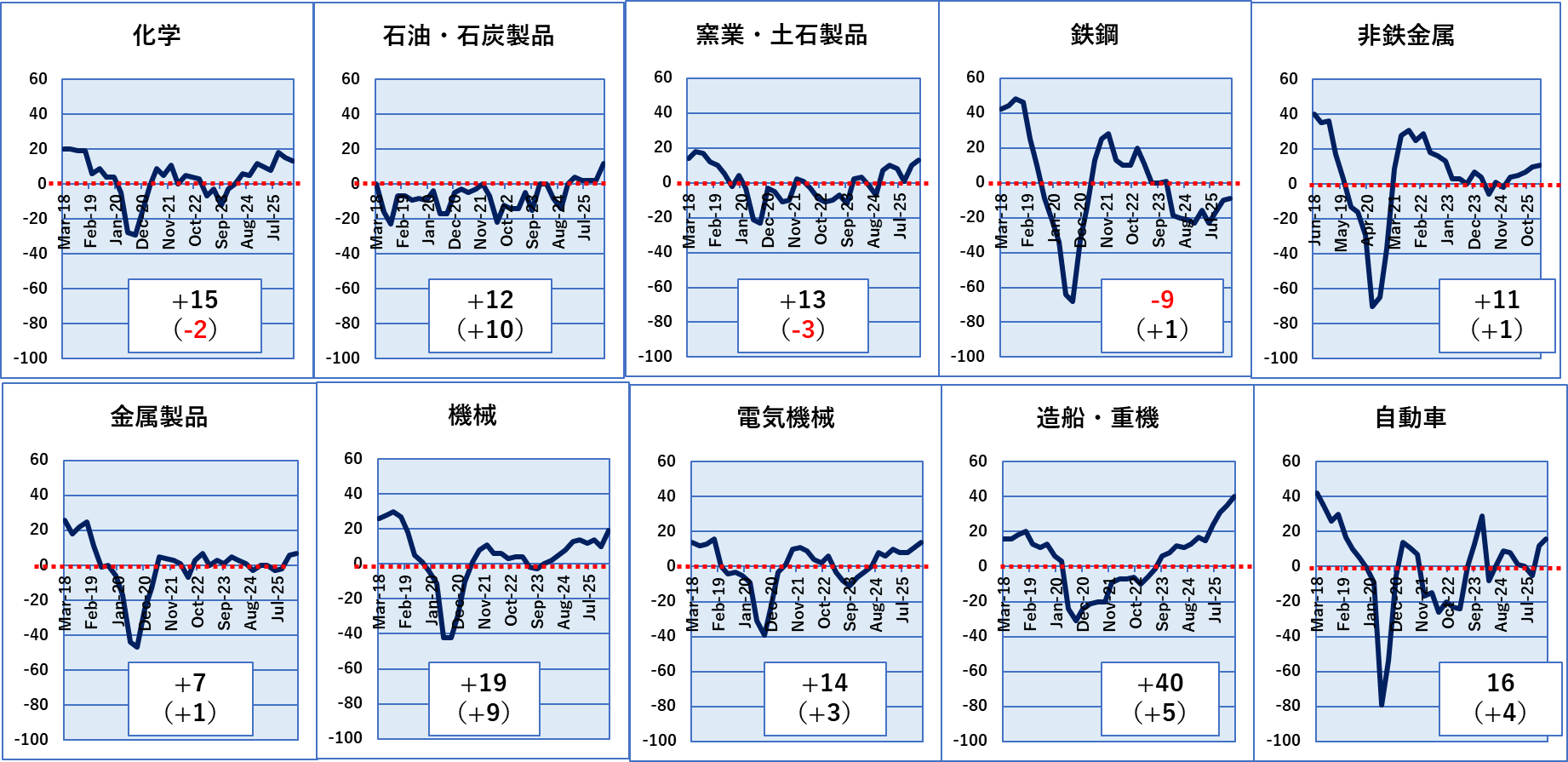 中小企業の製造業の各業種のDI値推移です。塗料に関係する業種を選択して載せています。