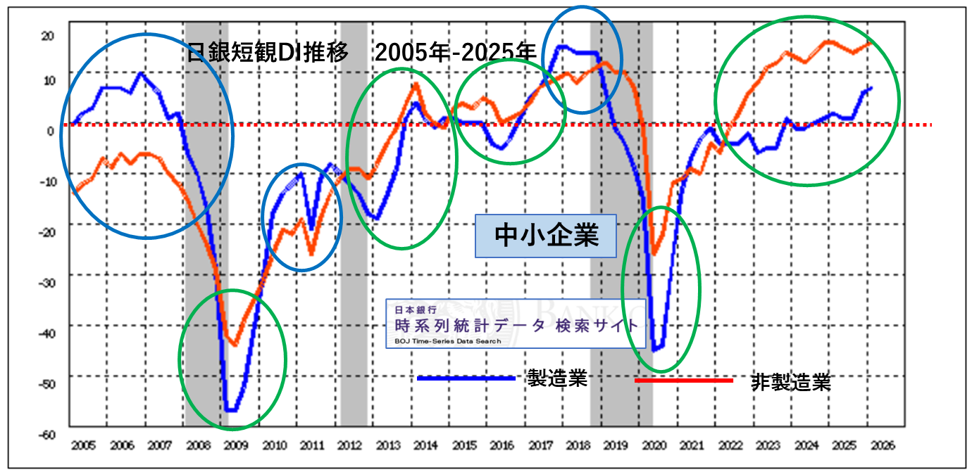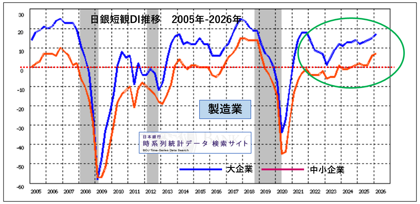 4月1日に日銀短観2026年3月調査分が発表になっていました。さぞかしイラン情勢不安の影響がみられるのでは思いましたが、3月上旬には過半数の会社が回答を提出していたそうで、ざっと見る限りイラン情勢不安の影響は明確には認められませんでした。いつもご紹介しているデータをご紹介していきます。