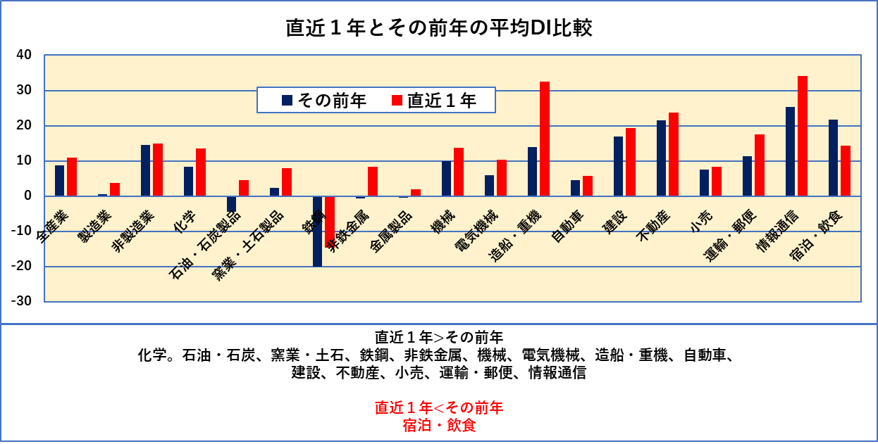 3月時点でDI値がマイナスの業種はありません。12月のDI値から下がったのは建設、不動産、宿泊・飲食の3業種でした。最後に直近の1年間の平均DI値とその前の1年間の平均DI値を比較して図示します。