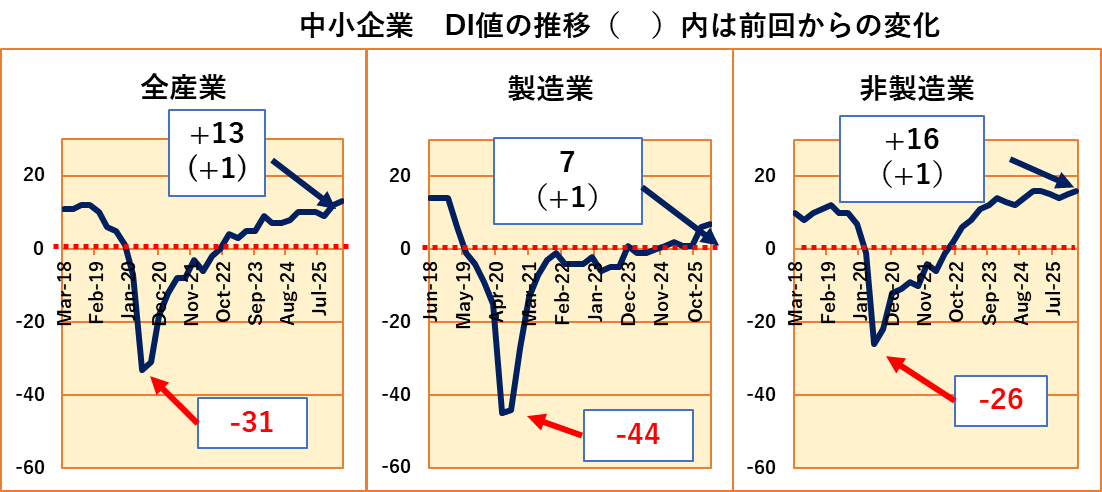 続いて中小企業の全産業、製造業、非製造業のDI値推移です。ここでも製造業、非製造業とも上向きでした。