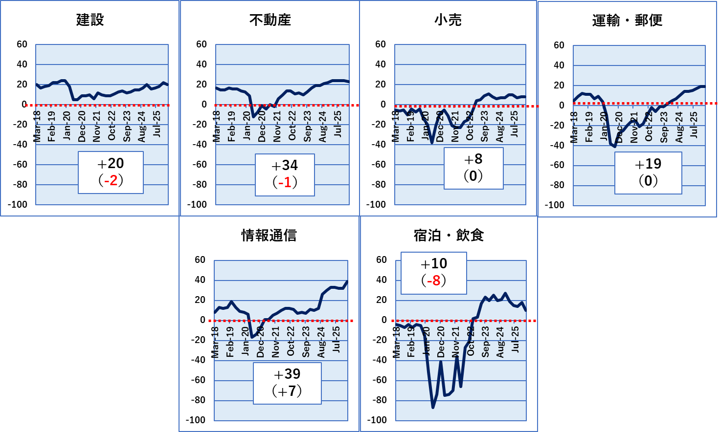 ほぼすべての業種において、直近1年の平均DI値がその前の1年の平均FI値を上回りました。下回ったのは飲食・宿泊だけでした。