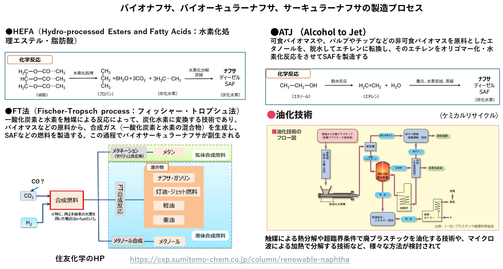 住友化学では、「リニューアブルナフサ」としてもう少し幅広く捉えて説明しています。上の三井化学では、植物由来のナフサのみを取り上げていましたが「リニューアブルナフサ」となるともう少し対象範囲が広がり、植物由来のバイオナフサに加え、廃食油由来などのバイオサーキュラーナフサ、さらに廃プラスチックから再生されるサーキュラーナフサの3種類があると説明されています。(下図左側参照)