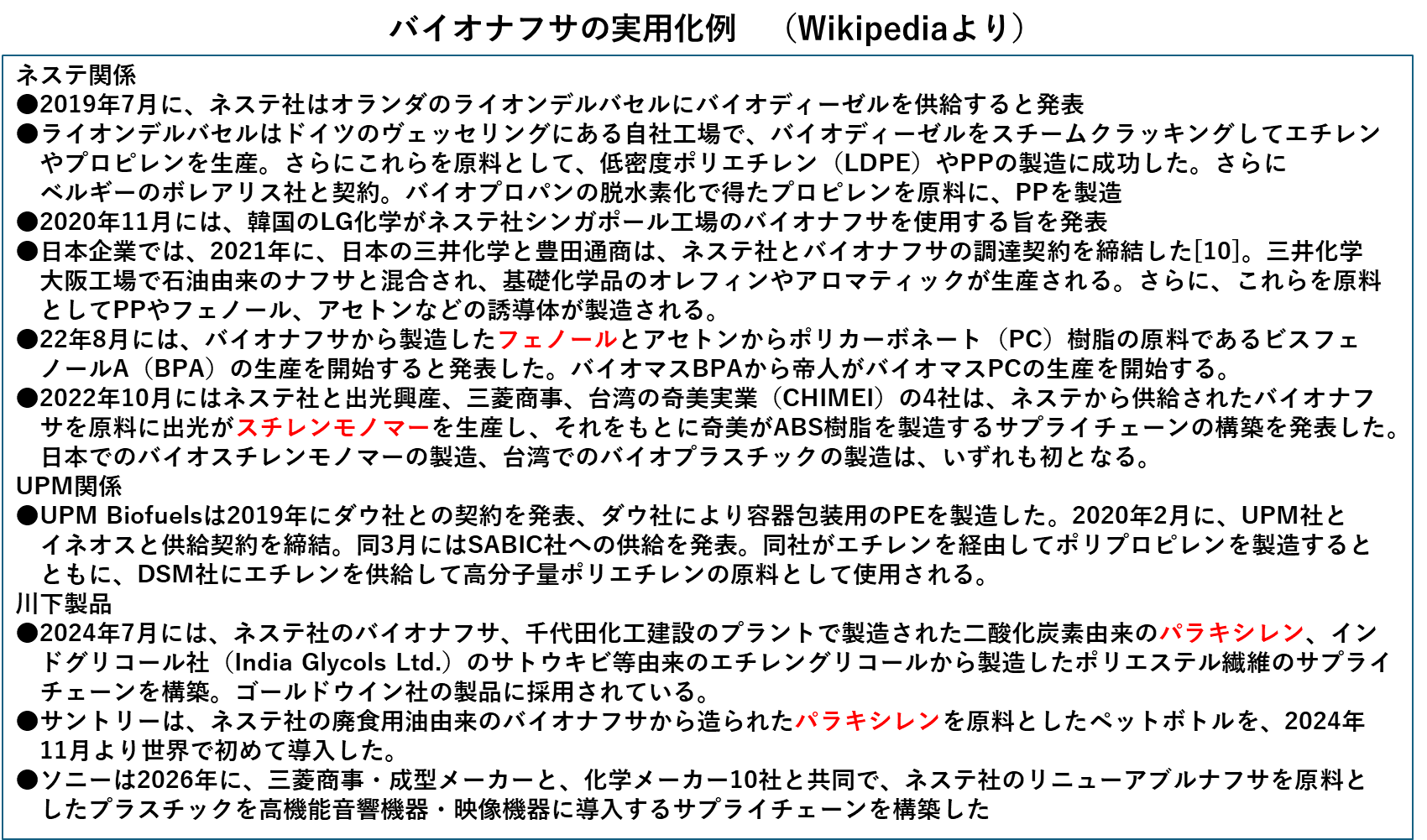 実用化、あるいは実証プラントにおいて芳香族炭化水素由来のものと思われるのを赤字にしてみました。フェノール、スチレン、パラキシレンと実績がありました、が、これらはいずれも樹脂原料であり、有機溶剤ではありません。果たして、総じて石油ナフサより高価なバイオナフサを使って、値段の安い溶剤を作ってくれるのかどうかはわかりませんでした。今でもキシレンの最大の用途はPETボトルですので、バイオナフサの時代になってもPET原料であるパラキシレンは生産されるでしょう。しかし溶剤のキシレンは作ってもらえるのについては、確信はもてません。